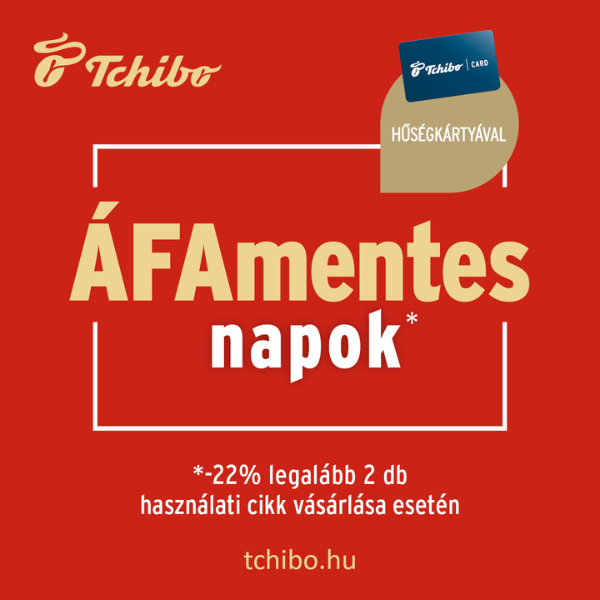 *A meghirdetett kedvezmény kizárólag TchiboCard hűségkártyával, legalább 2 db használati cikk egyidejű vásárlása esetén vehető igénybe 2026. április 1-jén a Tchibo üzleteiben. A promóciós kedvezmény érvényes a leárazott használati cikkekre, azonban nem vehető igénybe a leárazott kávéfőzőkre, a zsebszatyorra és az „Utolsó darabok” matricával ellátott termékekre. A kupon nem visszaváltható, más kedvezményekkel vagy promóciós ajánlatokkal nem összevonható. A webáruházban (www.tchibo.hu) a promóció feltételei eltérnek. Bővebb információért keressék eladóinkat bizalommal. A változtatás jogát fenntartjuk.
